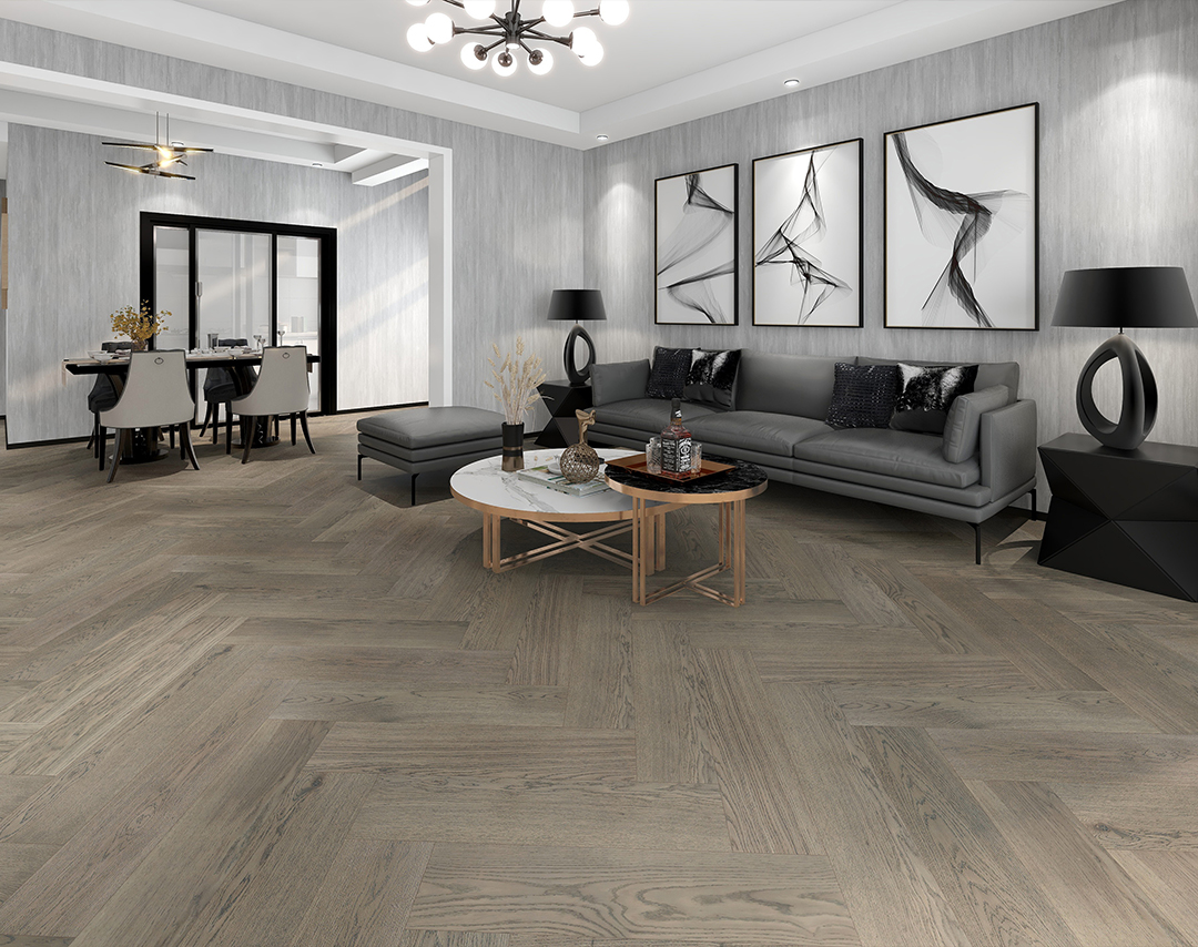 櫟木絢麗張揚的紋理搭配富有靈動跳躍感的人字拼,低調內斂的灰咖色在縱橫的紋理間濃淡相宜,疏朗有致,充滿了打破束縛,縱情瀟灑的不羈之感,空間中彌漫出對自由生活的無限向往。