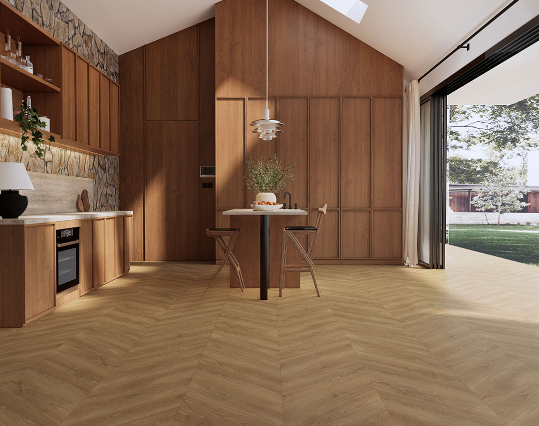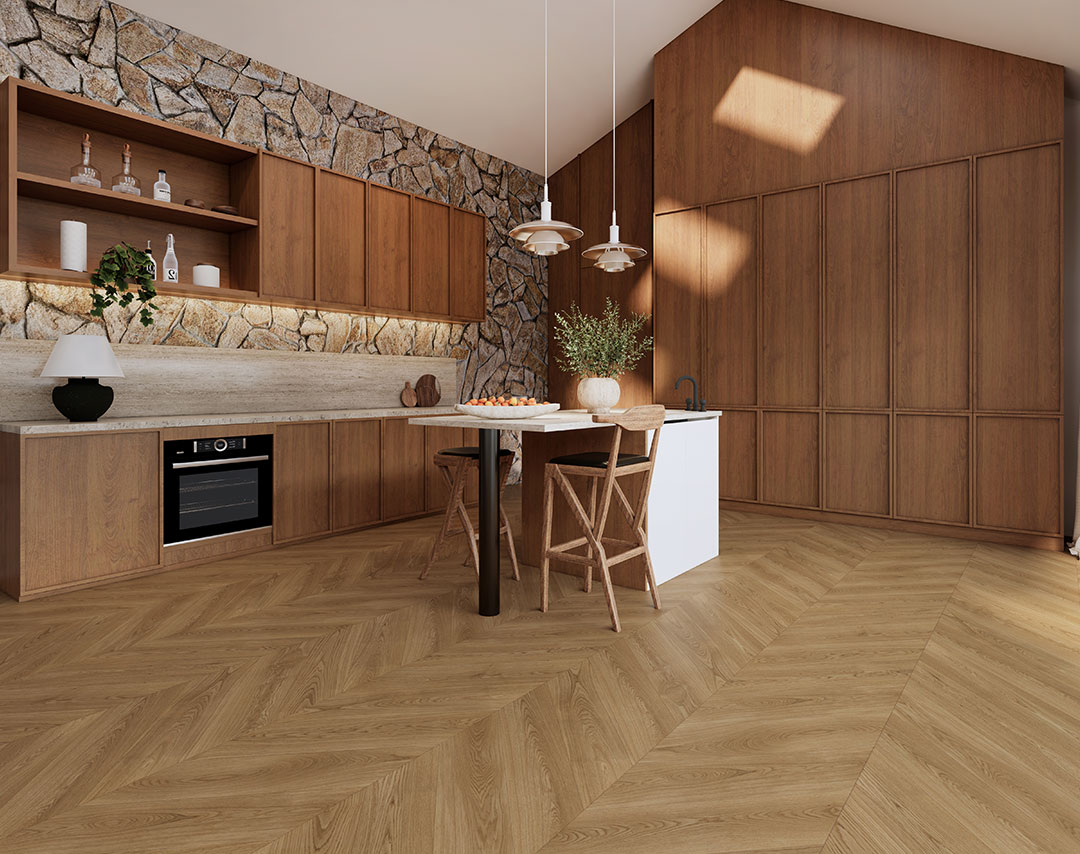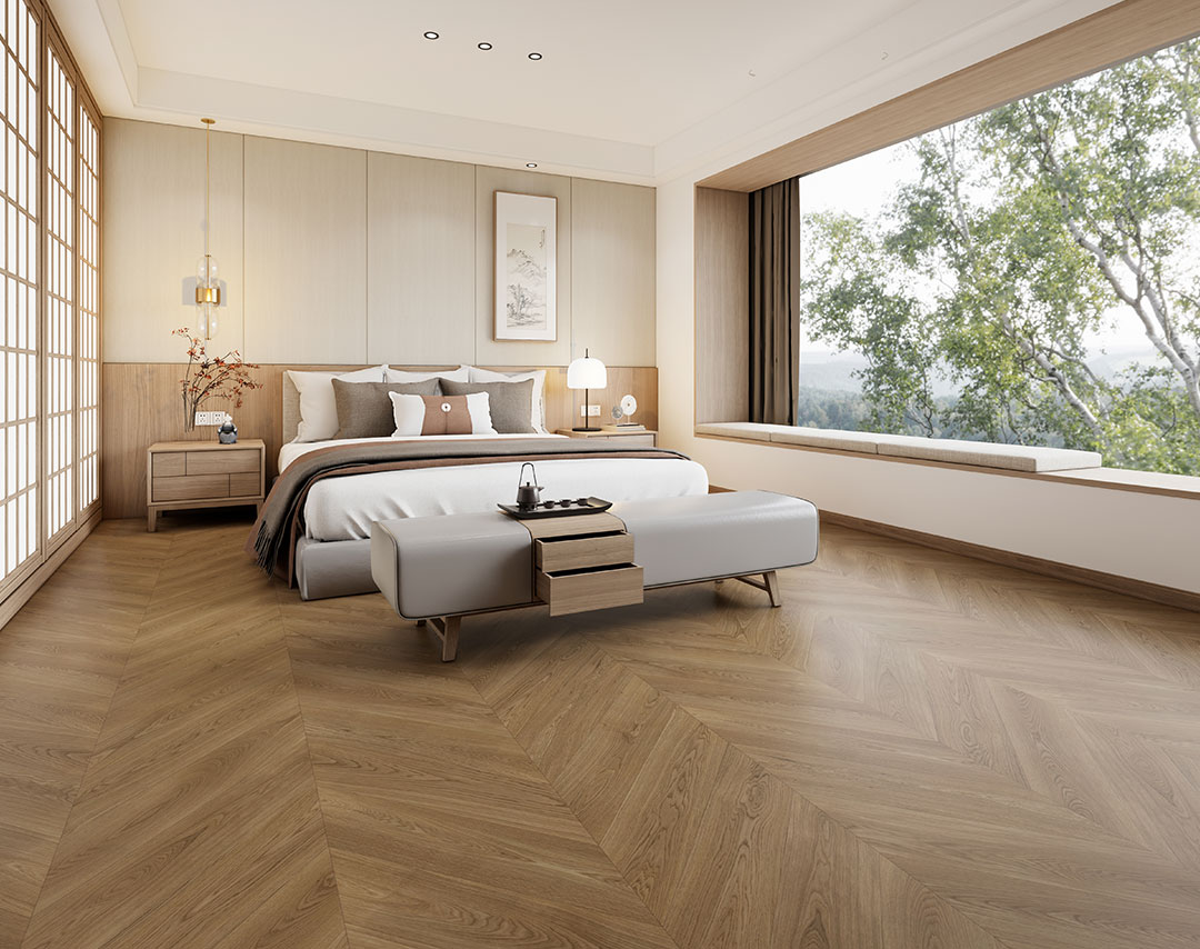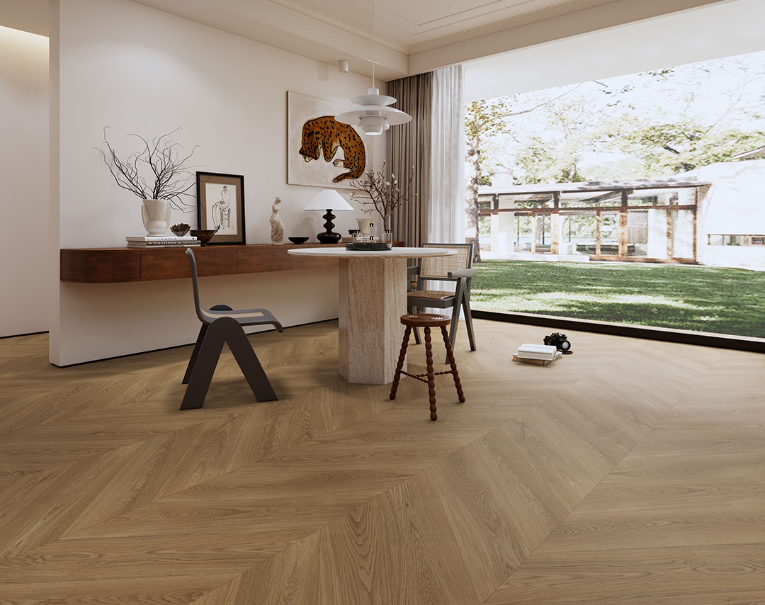 在嚴寒的大地上昂然生長,眼前的山峰、頭頂的云都變成了年復一年融在身體里的木紋。時間的魔法將它孕育,匠人的手將它雕刻,演繹出橡木魚骨拼的空間美學。