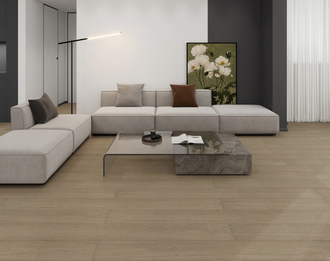 顏色不張揚也不沉悶,它在視覺上給人一種冷靜、沉穩的感覺,同時又具有一定的時尚感和現代感,能夠很好地融入各種裝修風格中,展現出低調高雅的氣質,與傳統的深色或淺色木地板相比,這一款木地板的顏色更加獨特,能夠為空間增添一份別樣的色彩。