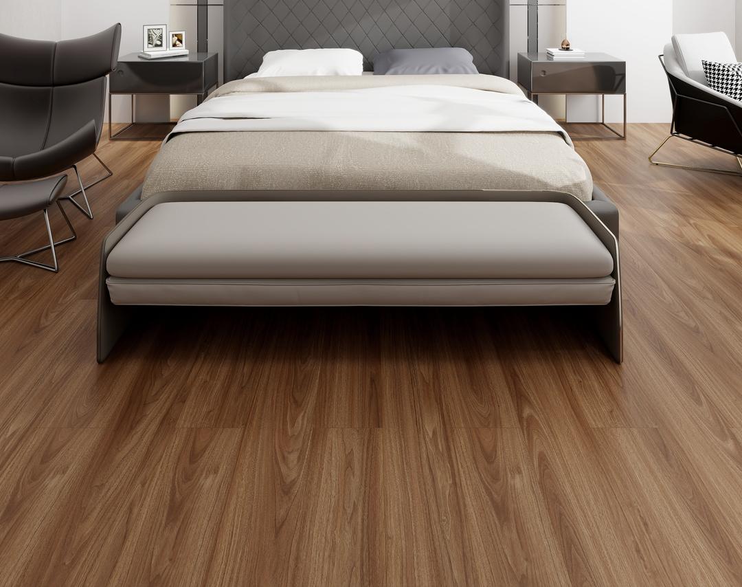 胡桃木色地板以溫潤的巧克力色調(diào),演繹低調(diào)的輕奢格調(diào)。搭配啞光石材臺面與金屬幾何裝飾,冷峻與暖意形成微妙對比,讓理性與感性在居所中共生。