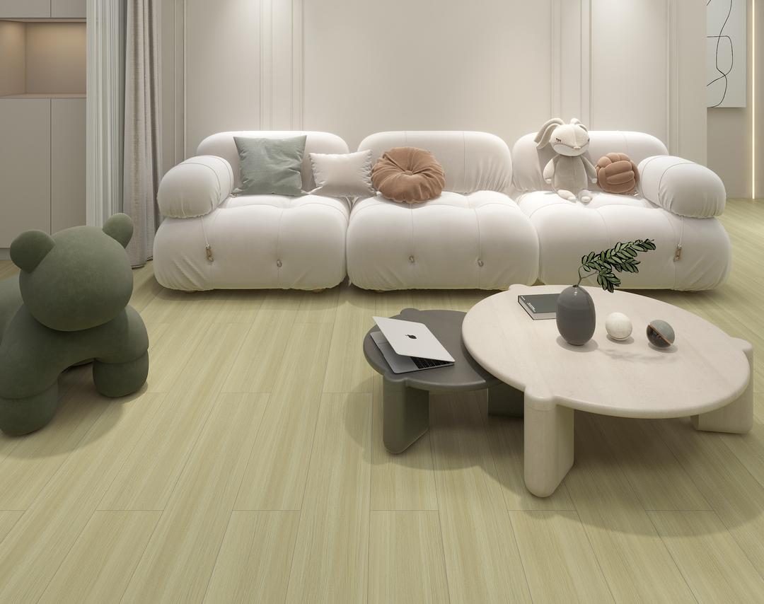 奶油色地板散發著柔和的光澤,仿佛是陽光灑落在溫暖的沙灘上,給人一種輕松愉悅的感覺。這樣的地板與輕盈的布藝沙發和淡雅的墻面相結合,能夠創造出一種明亮而開闊的空間感,使居室充滿溫馨與活力,仿佛每一個角落都在訴說著家的溫暖