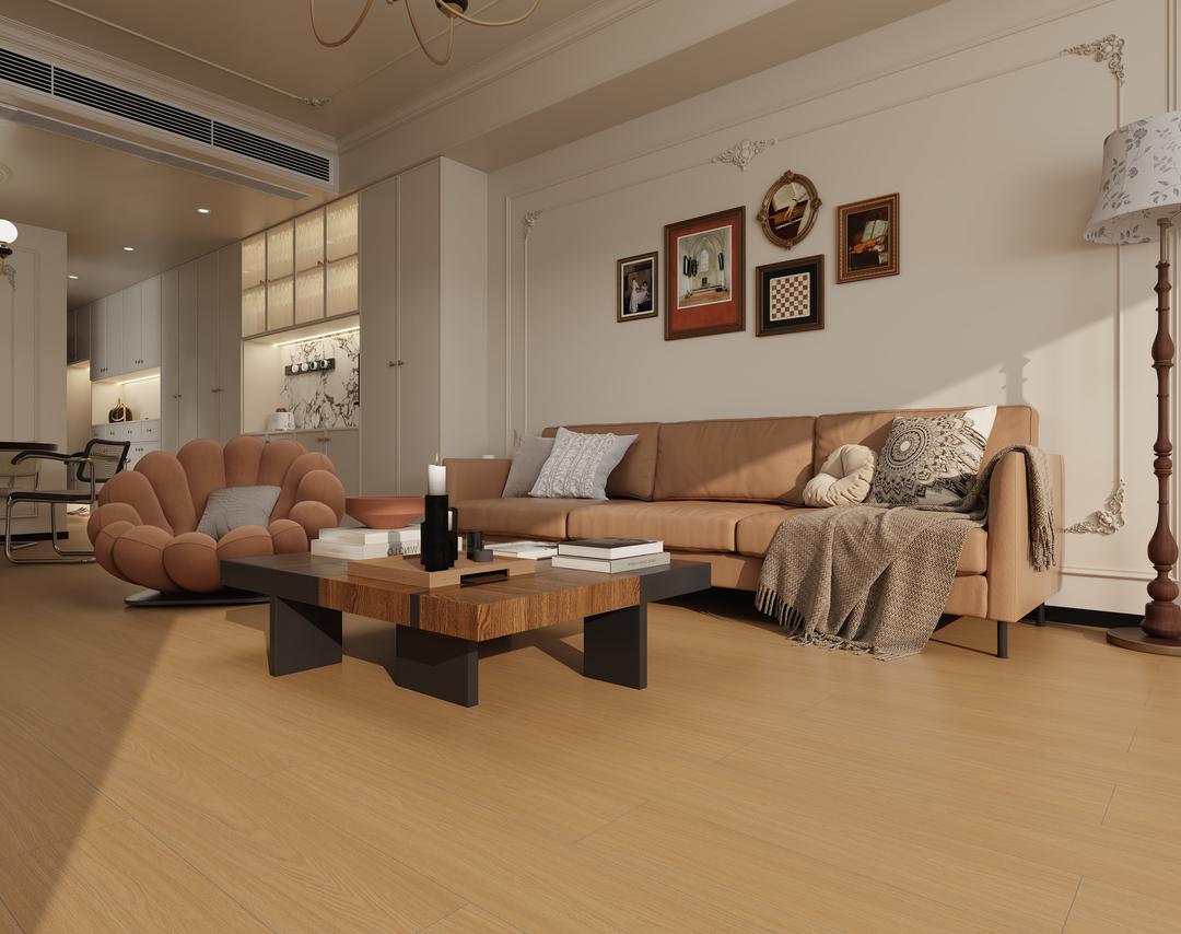 原木色地板,以蜂蜜色的樹脂在百年橡木年輪中緩慢凝固的瞬間為靈感,在空間維度上拓印出時光的琥珀標本。其表面肌理交織著晨露浸潤的松脂光澤與斧鑿留痕的粗獷筆觸,在2.5毫米精度的現代銑削工藝中,意外保留了山風掠過林隙的波動軌跡——既能軟化混凝土墻體的冷硬幾何,又能為黃銅裝飾件的工業鋒芒裹上包漿般的溫潤濾鏡。當人造光源與自然天光在其曲面邊緣發生光學博弈時,木色會析出焦糖瑪奇朵的綿密層次,讓智能家居的科技脈搏與手作木器的呼吸頻率達成微妙共振,使居住空間蛻變為封存了森林晨昏與人類體溫的生態容器。